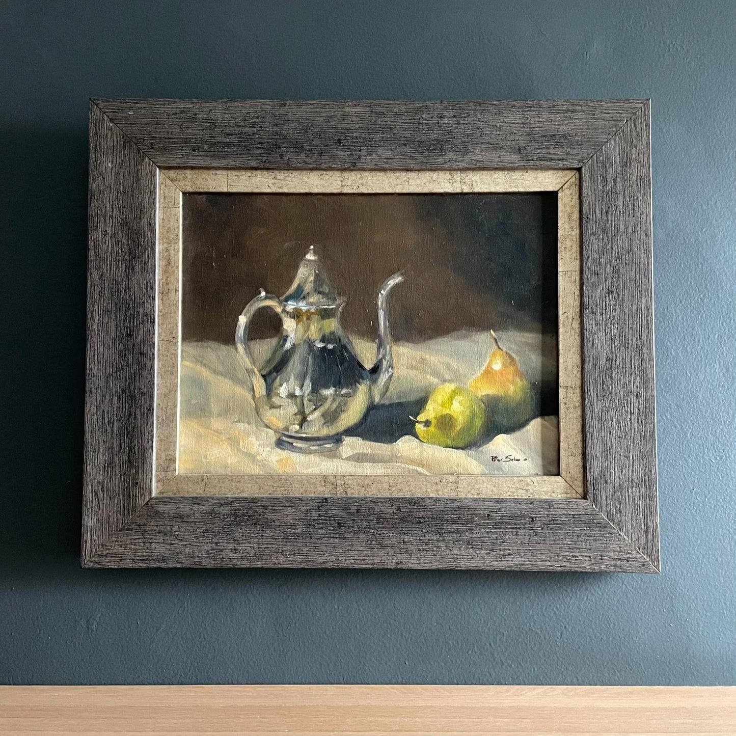 A study in light and texture, Afternoon Table captures the gentle glow of a silver coffee pot and ripened pears resting on a linen-draped surface. This still life invites contemplation—an ode to slow living and the elegance of everyday objects. Framed in rustic wood with a gold edging.